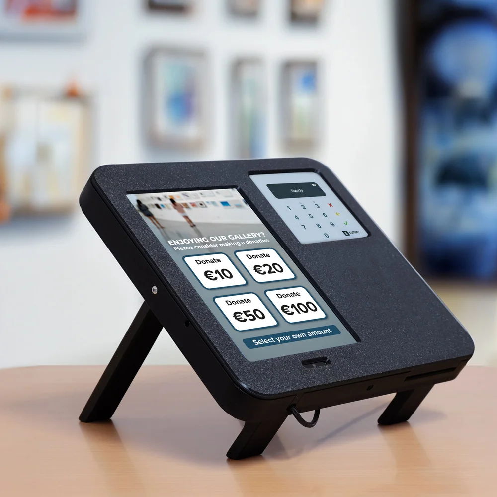 The TapTile is a compact and attractive enclosure to enable your organisation to accept card and contactless payments. It can be wall mounted, used as a counter top point device or passed around to collect contactless donations. Counter-top mounting legs are optional and can be purchased separately.