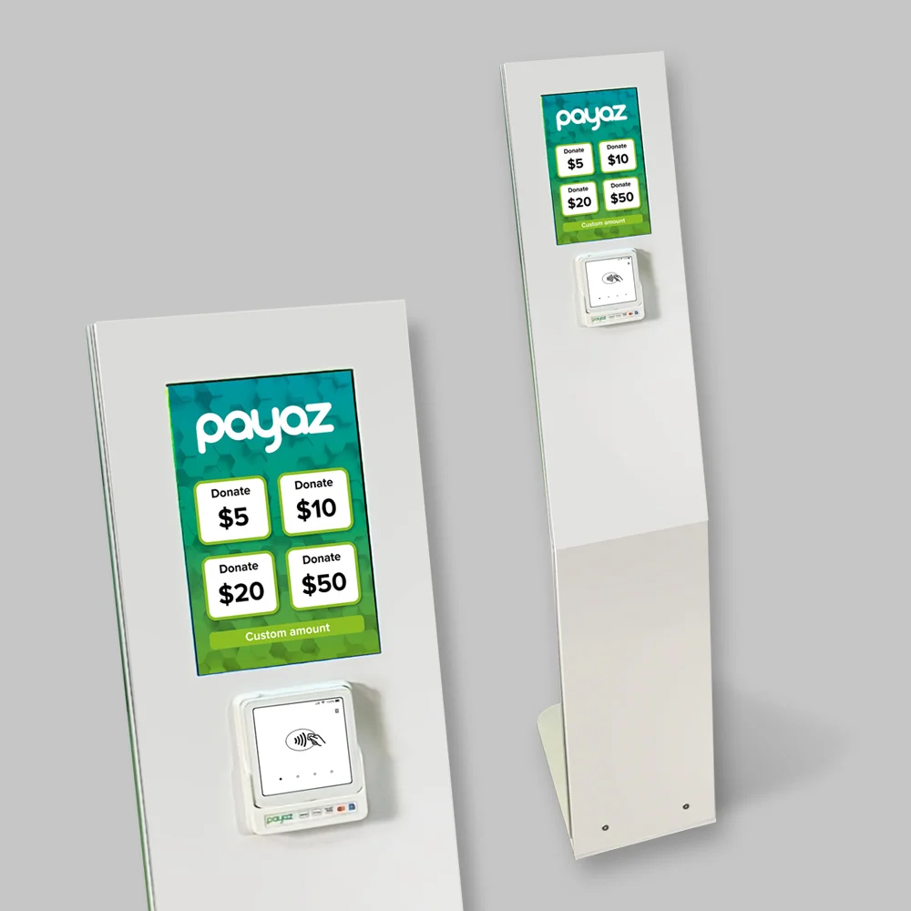 The front face of the GivingStand Plus can also be completely branded with your design increasing its visual appeal and helping to further enhance your message. A template for your artwork can be downloaded here. Designs should be full size at 300dpi or in vector format. Email your artwork to studio@payaz.com